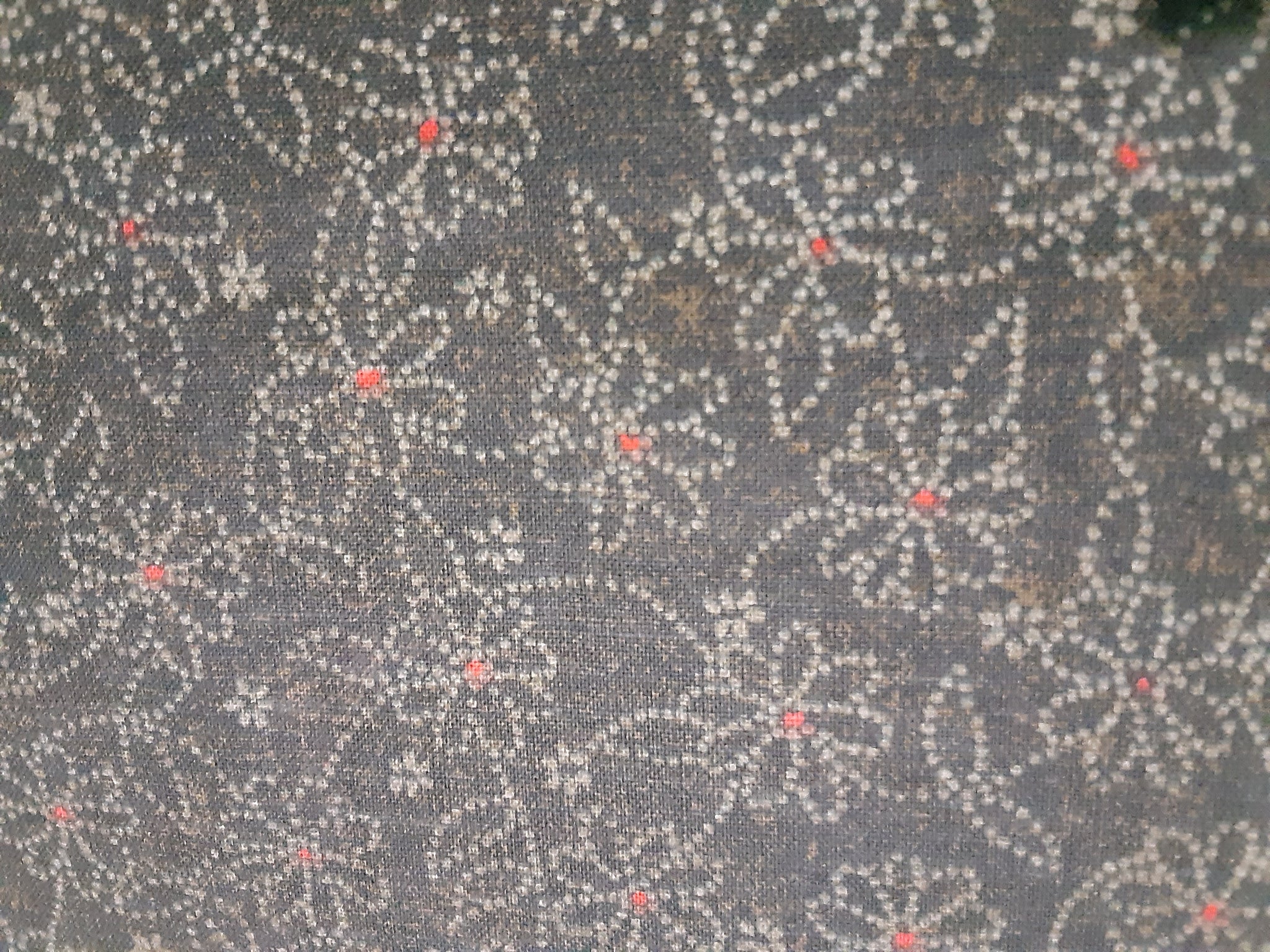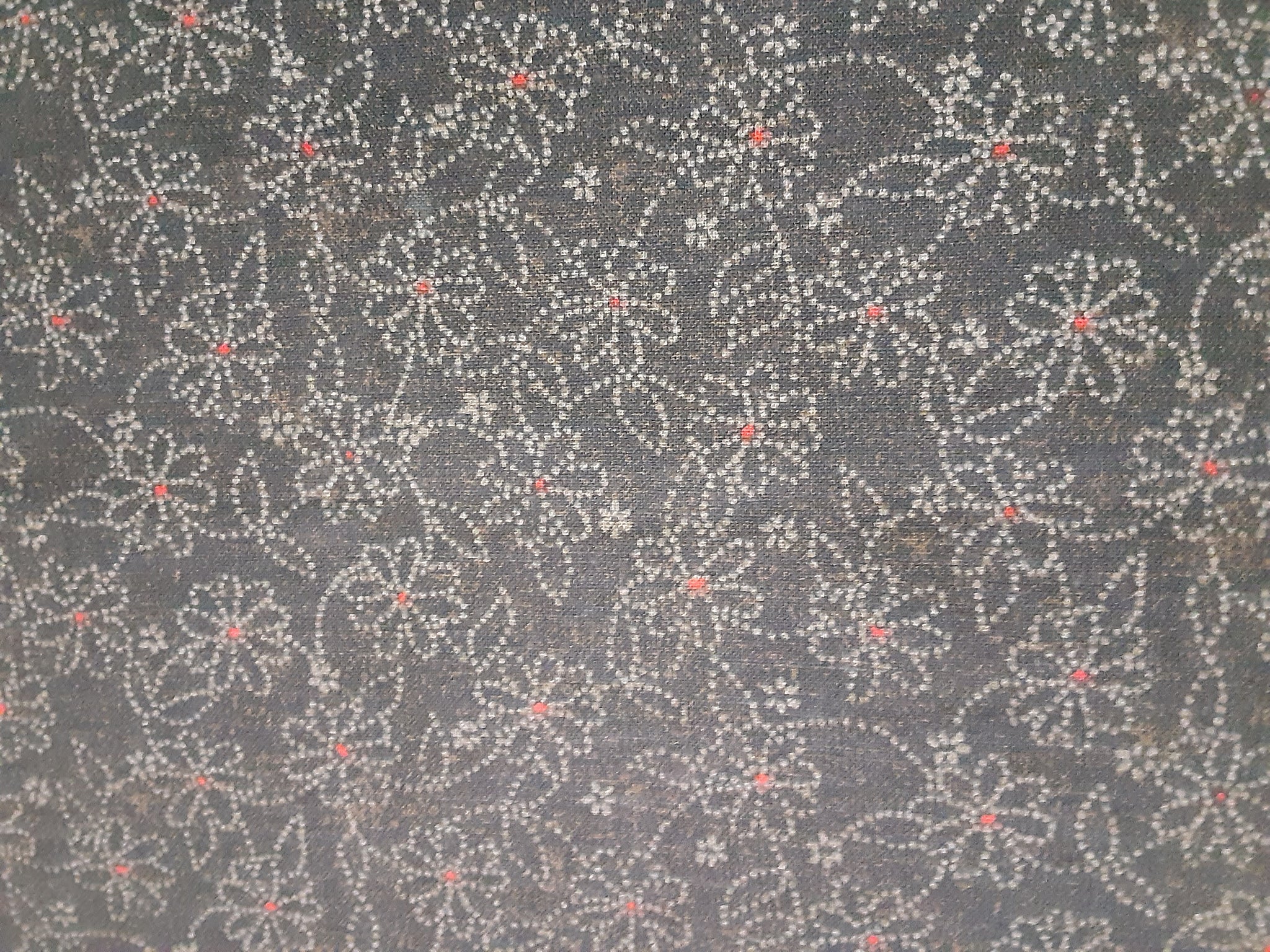 This cute, dainty, flower fabric is a much darker green than I could capture with my phone. There could be a bit of a holiday feel to this fabric with the colors of green and a tiny red dot with each flower..